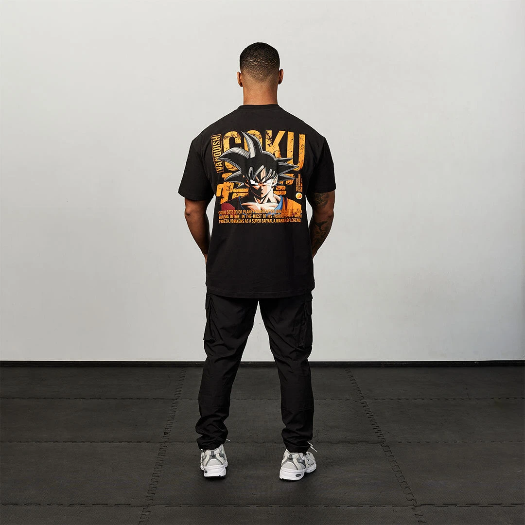 These t-shirts come in a cotton blend fabric with a straight hem in the oversized fit you know and love. The back features official artwork of Goku with overlay text in a distressed print with smaller printed branding on the front.
