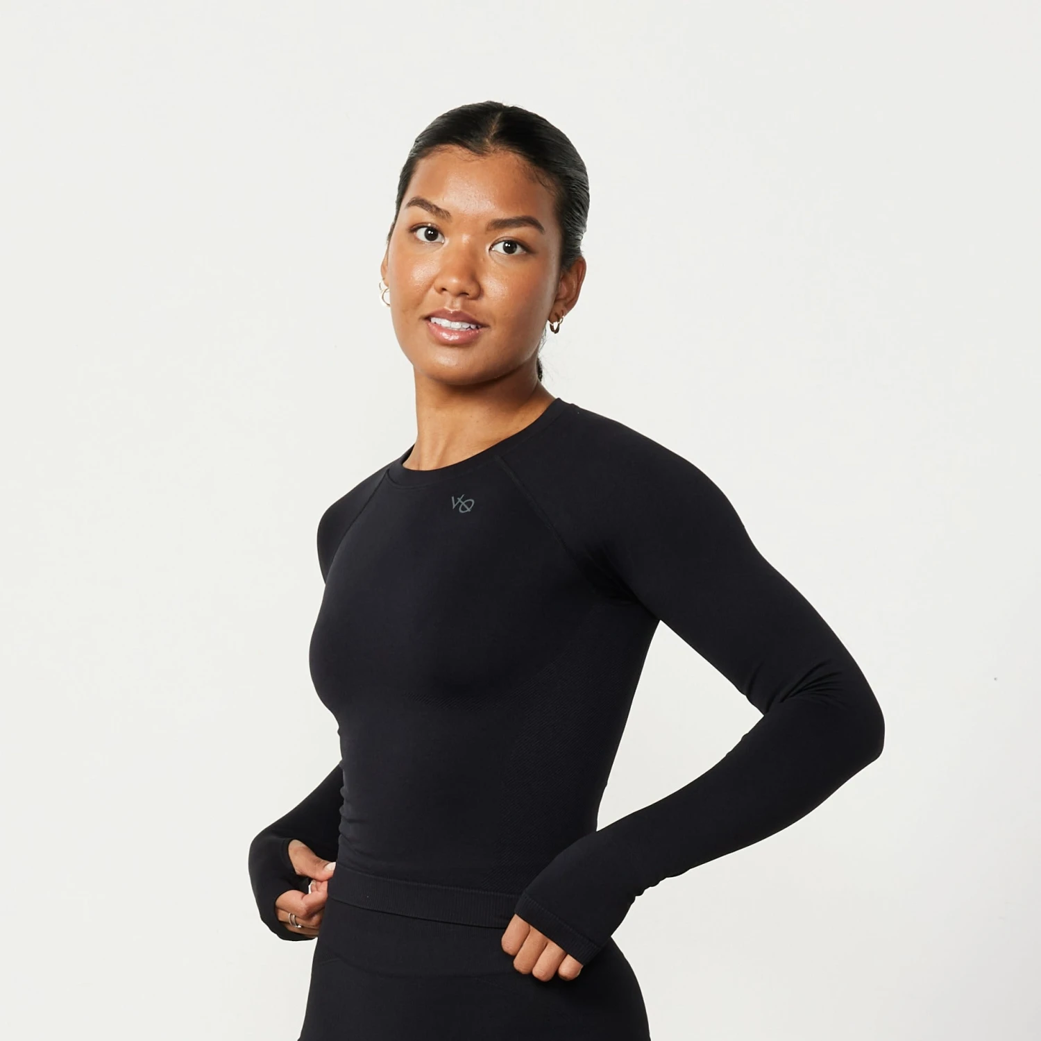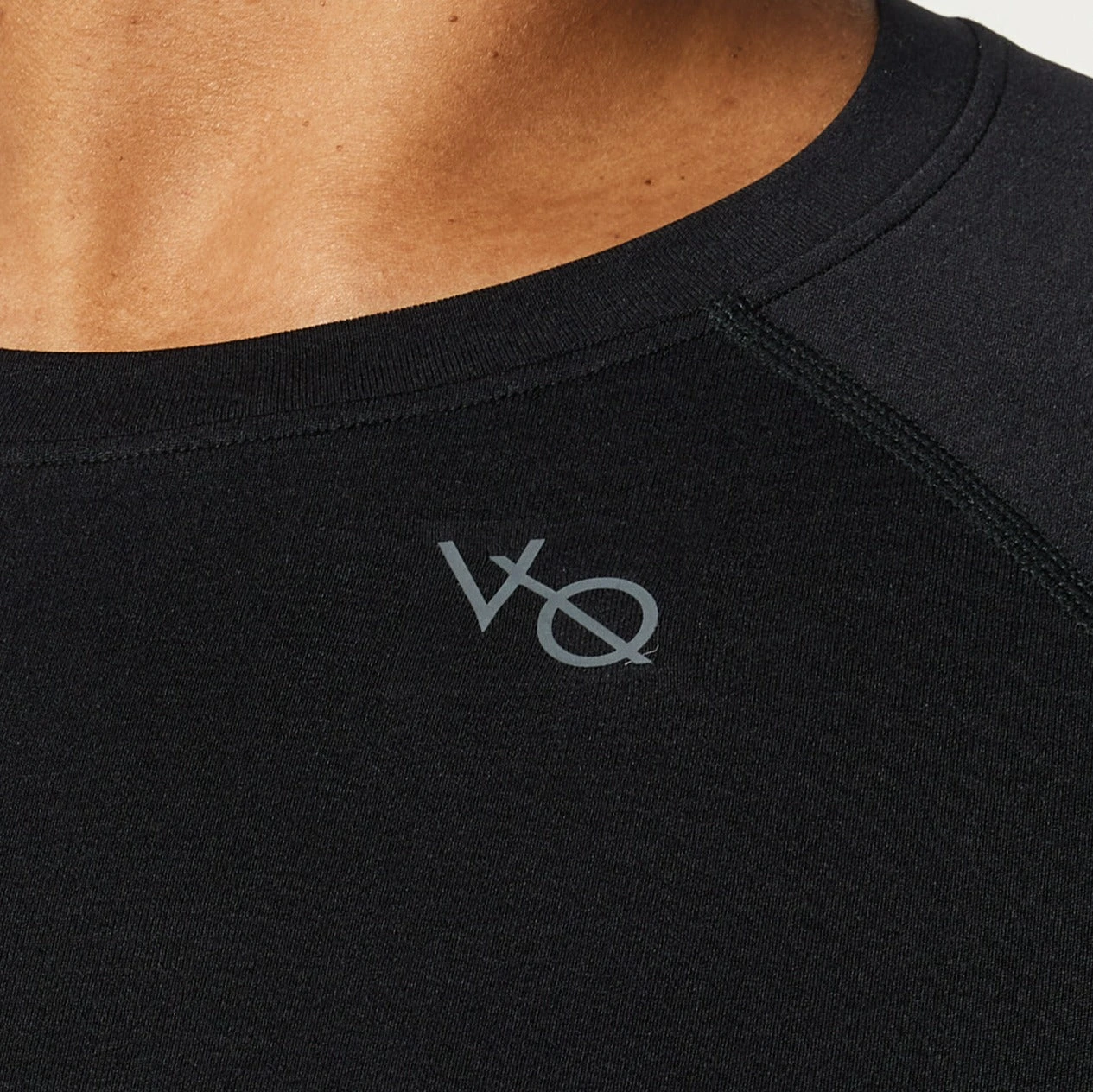 This brand new style of long sleeve top features flattering contour lines at the front and back with raglan style sleeves. This top comes in a longer length, with longer length sleeves featuring thumbholes, finished with a minimal VQ logo on the chest.