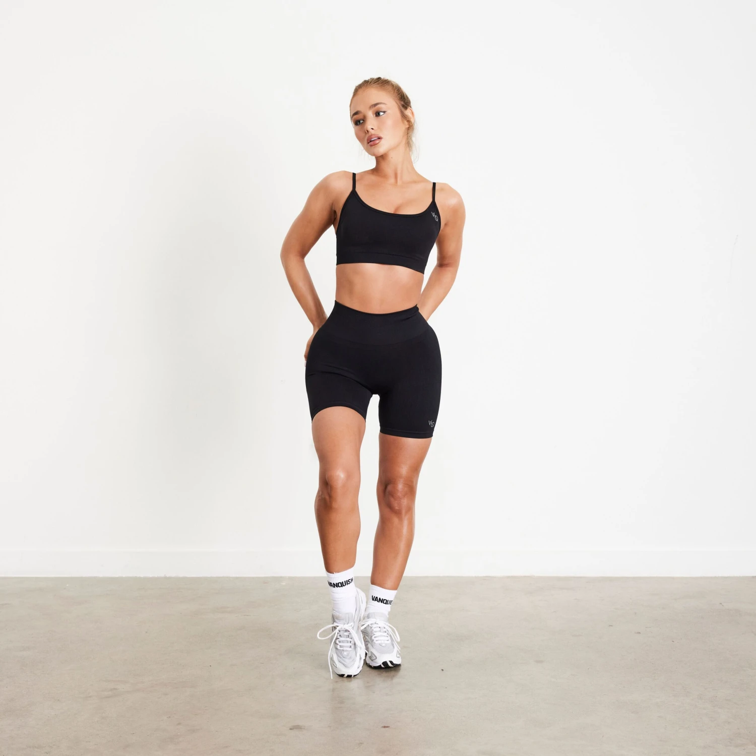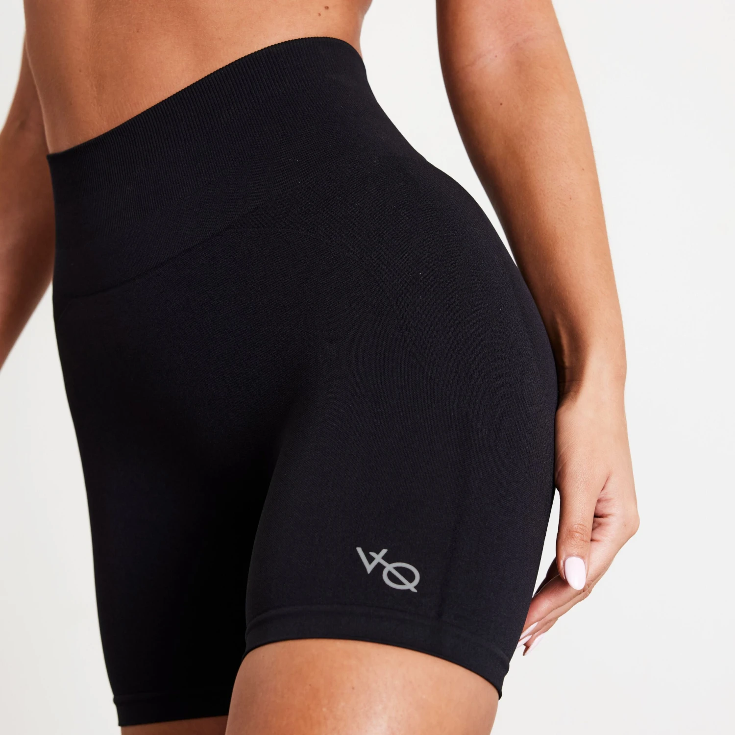 These seamless shorts feature flattering contour details on the sides and a scrunch bum, with a deep ribbed waistband to sculpt the body, finished with a minimal VQ logo.