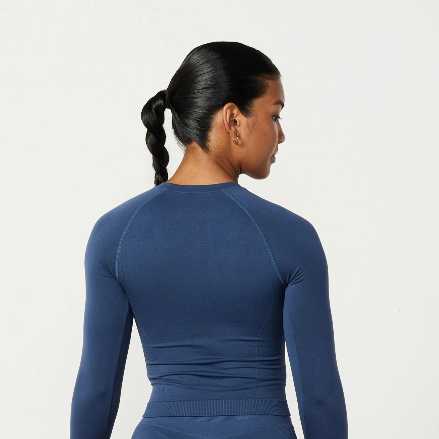 This brand new style of long sleeve top features flattering contour lines at the front and back with raglan style sleeves. This top comes in a longer length, with longer length sleeves featuring thumbholes, finished with a minimal VQ logo on the chest.