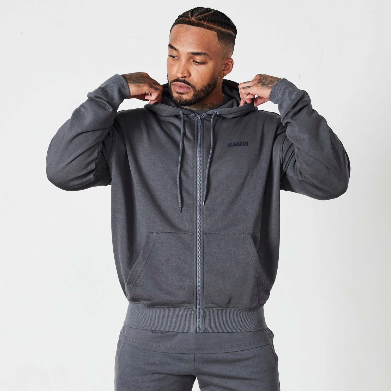 This brand new style of full zip hoodie comes in an oversized fit with relaxed forward shoulder seams and a front kangaroo pocket. Featuring a minimal tonal Vanquish logo on the left chest with deep ribbed cuffs and waistband.