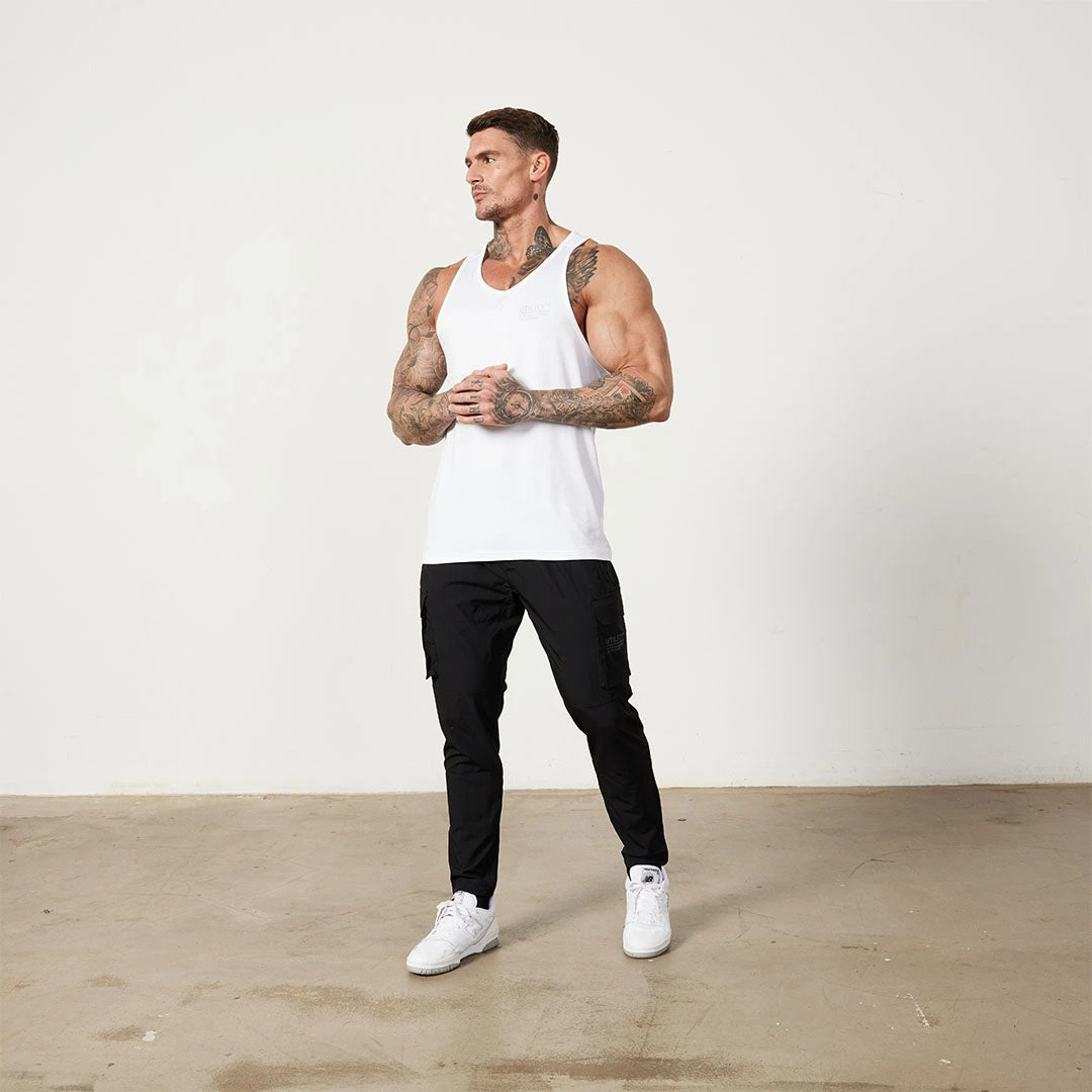 These cargo pants are made from an improved four way stretch Polyester fabric, with elasticated drawcords on the waist and leg, zipped side pockets, cargo style patch pockets and a back pocket. Finished with a self fabric t-shirt loop in the waistband and raised rubber branding on the cargo pocket, these are perfect for any workout.