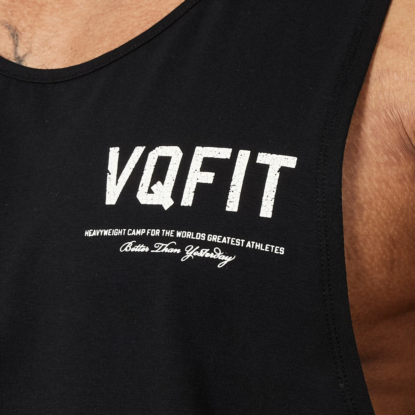 These tank tops come in a loose fit with a relaxed armhole and backwards shoulder seam. The neckline and armhole features a binding finish giving it that premium feel with a smaller VQFIT graphic print on the front chest.