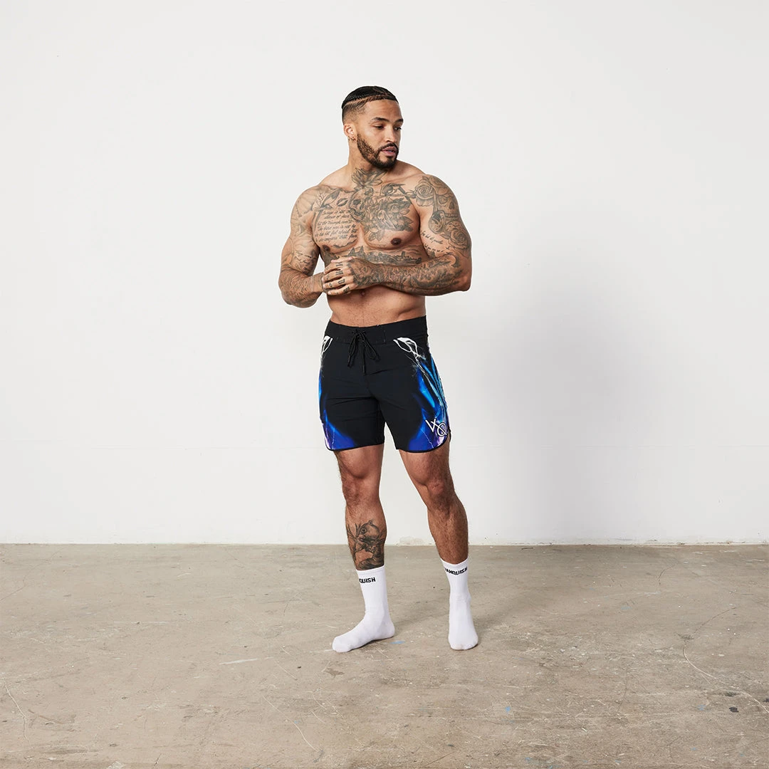 These board-shorts have a lightening print that is curved at the outer leg to enhance the quads, the lightening print finishes at the waistband, pointing towards the core, to highlight the overall physique. Featuring a drawcord fastening for easy adjustment, covered by Velcro, for a neat finish around the crotch. The Fabric is a 4 way stretch material, allowing for easy movement when on stage.